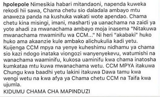 Pamoja na hayo polepole amefafanua kuwa “Ni heri abaki huko huko (Chadema) au akaanzie kule ambako alichukulia kadi yetu, Kuijenga CCM mpya yenye kuheshimu nidhamu ya chama siyo kazi ndogo na inataka viongozi wenye unyenyekevu, watumishi na wanachama wavumilivu. CCM mpya itakuwa chungu kwa baadhi yetu lakini tamu kwa wengi wetu”